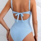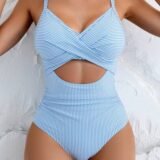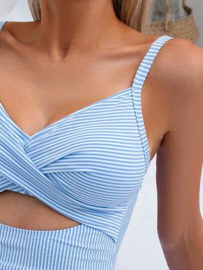 A modern and flattering one-piece swimsuit featuring soft blue and white stripes with a stylish wrap-front bodice. The adjustable shoulder straps and textured fabric add both style and ease, making it perfect for relaxed beach days, poolside lounging, or resort vacations.