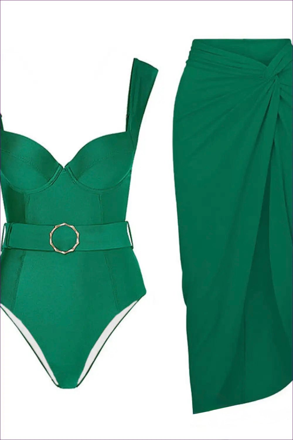 A sophisticated one-piece swimsuit in deep emerald green, featuring structured cups, thick straps, and a stylish waist belt for a flattering silhouette.