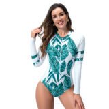 This stylish and comfortable long sleeve one-piece swimsuit features a vibrant tropical leaf print in shades of green on a white background. The design includes a front zipper for easy wear and a sporty yet elegant look. The swimsuit is made from a high-quality, stretchy fabric that offers a flattering fit and excellent freedom of movement. It’s an ideal choice for women who want both style and practicality in their swimwear.